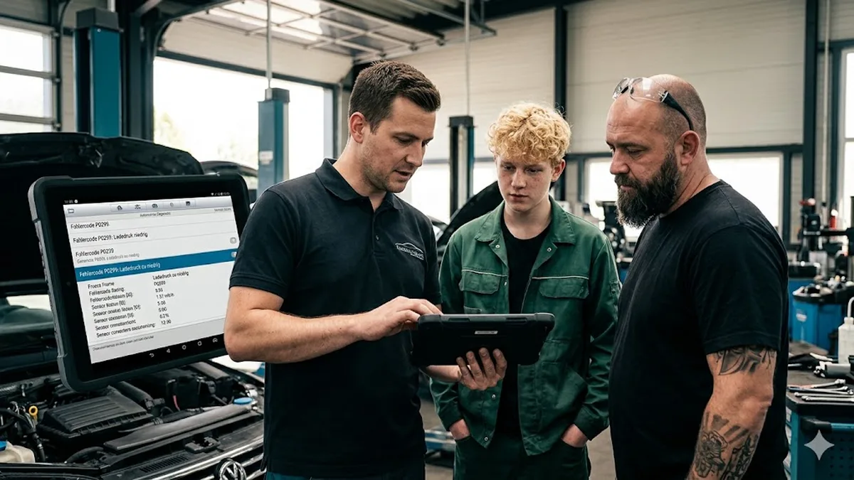 Der Fehlercode P0299 ist ein Symptom, keine Diagnose. Ohne die Möglichkeit, Stellglieder aktiv anzusteuern und Sensorwerte in Echtzeit auszuwerten, bleibt die Ursachenfindung ein Ratespiel. Mit der Herstellerdiagnose identifizieren wir die defekte Komponente präzise – und setzen gezielt instand.