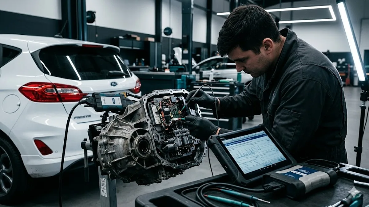 Powershift (Automatik): Die automatisierte Doppelkupplung ist im Fiesta MK8 weniger verbreitet, aber verfügbar. Die trockene Doppelkupplung zeigt im Stadtverkehr erhöhten Verschleiß. Die Diagnose liest den Kupplungsverschleißwert als Prozentwert aus und beurteilt die Restlebensdauer.
